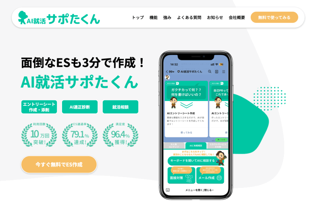 | AI就活サポたくん | AIによるES添削特化 | ★★★★☆ | 書いた文章の質を上げたい人/仕上げが不安な人 | 読みやすい文章に整える力が強い・客観的添削が優秀 |