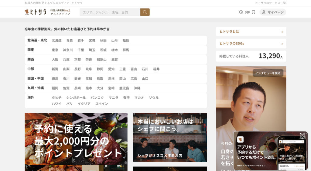 「ヒトサラ」はプロの料理人が厳選したお店情報を集めたグルメサイト。