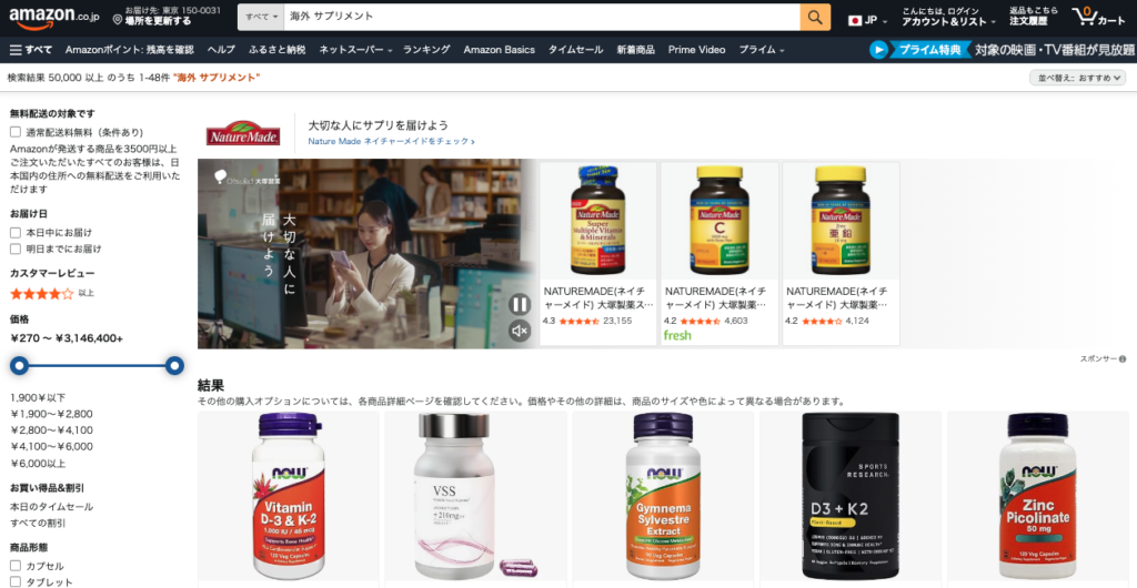 Amazonでは海外のサプリブランド製品を海外発送や現地正規輸入品で購入できるケースが多いため、レビューや評価を見ながら選べるのがメリットです。海外直輸入商品の扱いも多く、種類の幅広さは魅力のひとつです。