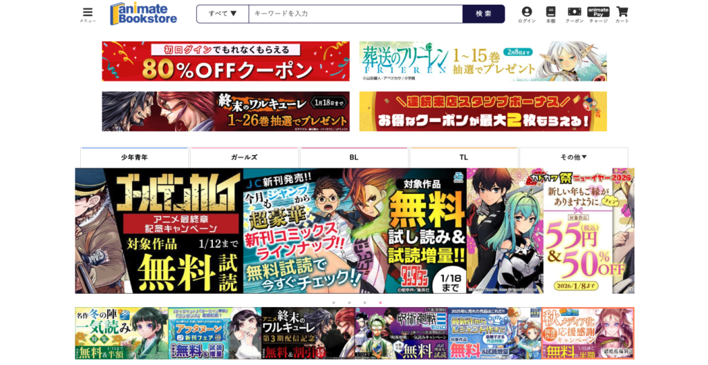 アニメイト実店舗とも連動したフェア・キャンペーンが開催され、新刊・話題作・限定タイトルもチェックできます。