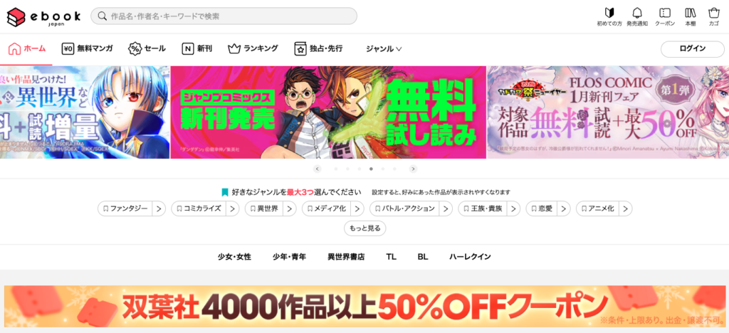 漫画・小説・雑誌・BL・TL・ラノベなど、幅広いジャンルで人気作品が揃っているか。