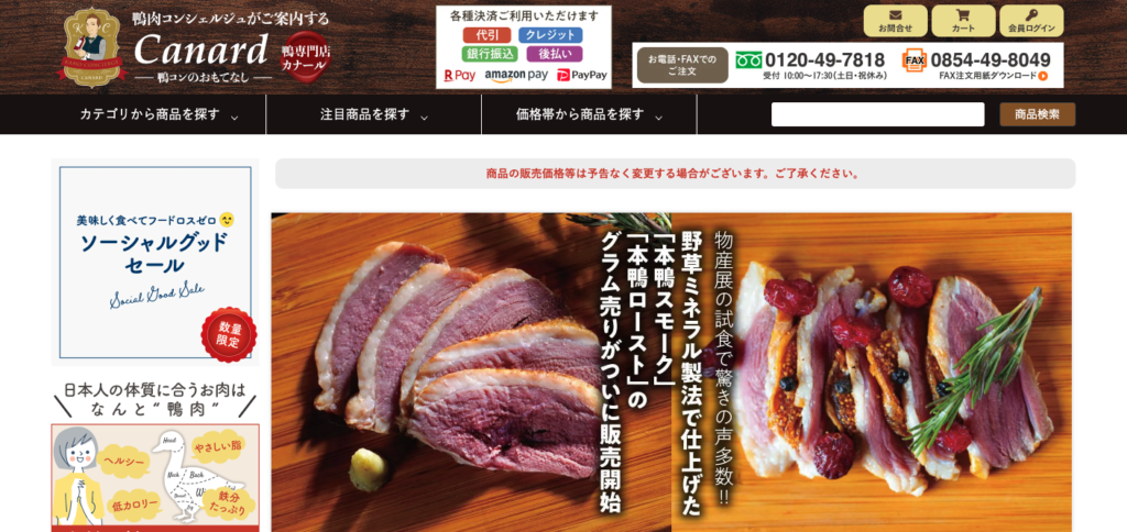 鴨肉専門の通販サイトで、定番の合鴨鍋から本鴨鍋、コンフィやスモークなど多彩な鴨料理を取り扱っています。冬のごちそうとして、贈答用としても人気です。