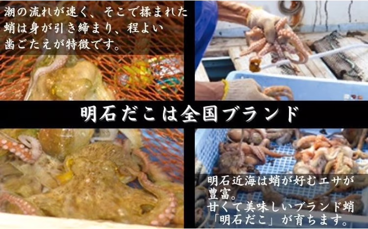 「タコといえば明石」と言われるほど、その名は全国に轟いています。明石海峡の激しい潮流に流されないよう、しっかりと岩にへばりついて育つため、足が太く身が驚くほど締まっています。