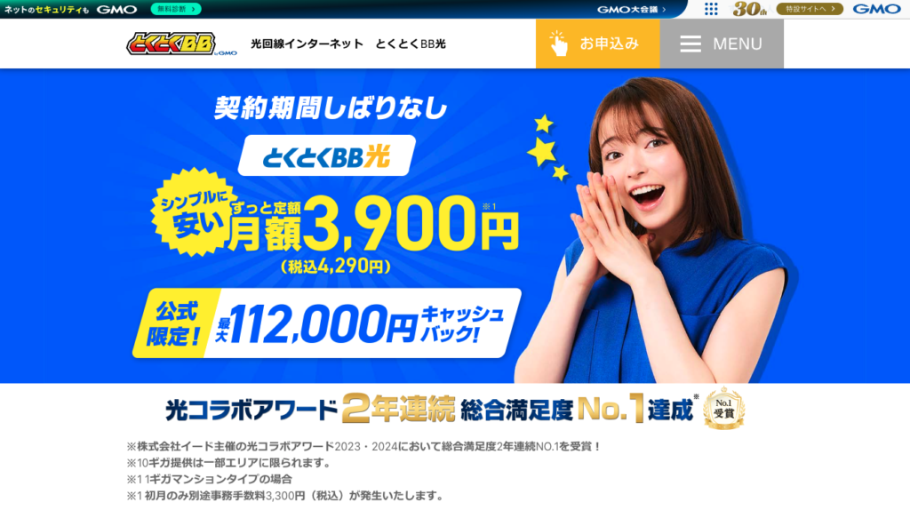 「セット割とか難しいことは分からない」「とにかく毎月の支払いをシンプルに安くしたい」という方には、GMOとくとくBB光(GMO光アクセス)がおすすめです。