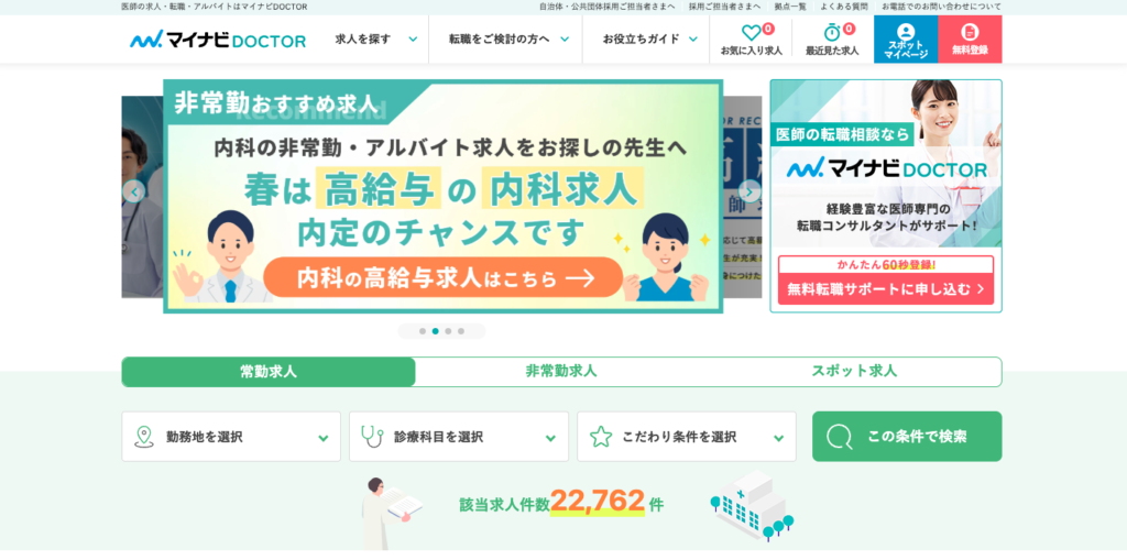 若手の先生には、大学病院や大規模な総合病院の求人に強い「マイナビDOCTOR」などの活用が向いています。