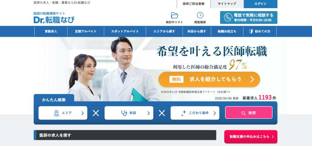 産業医やクリニックへの転職を視野に入れているなら、「Dr.転職なび」も有力な選択肢となります。