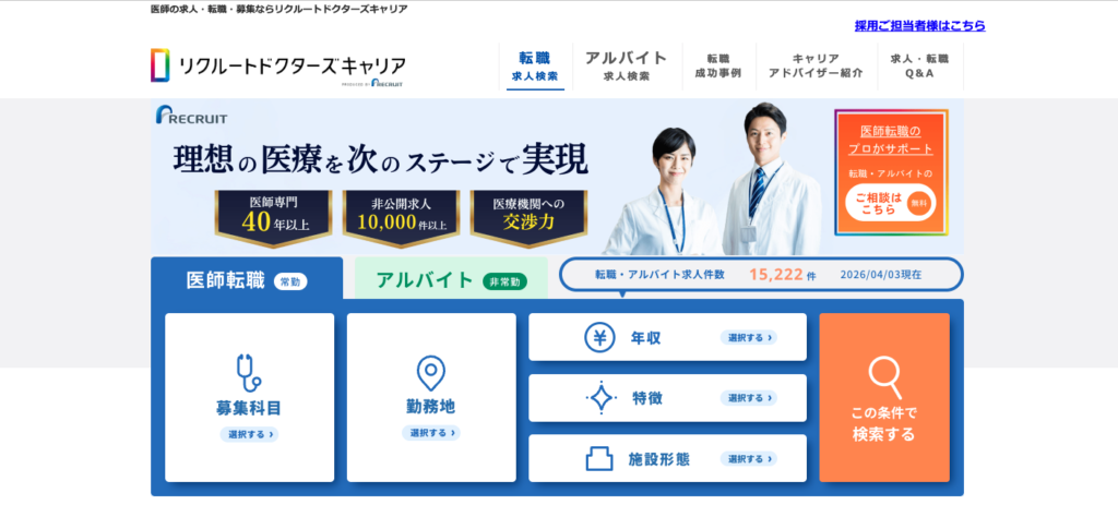 | リクルートドクターズキャリア | 約15,000件 | あり | 常勤・非常勤 | 全国 | 公式サイト |